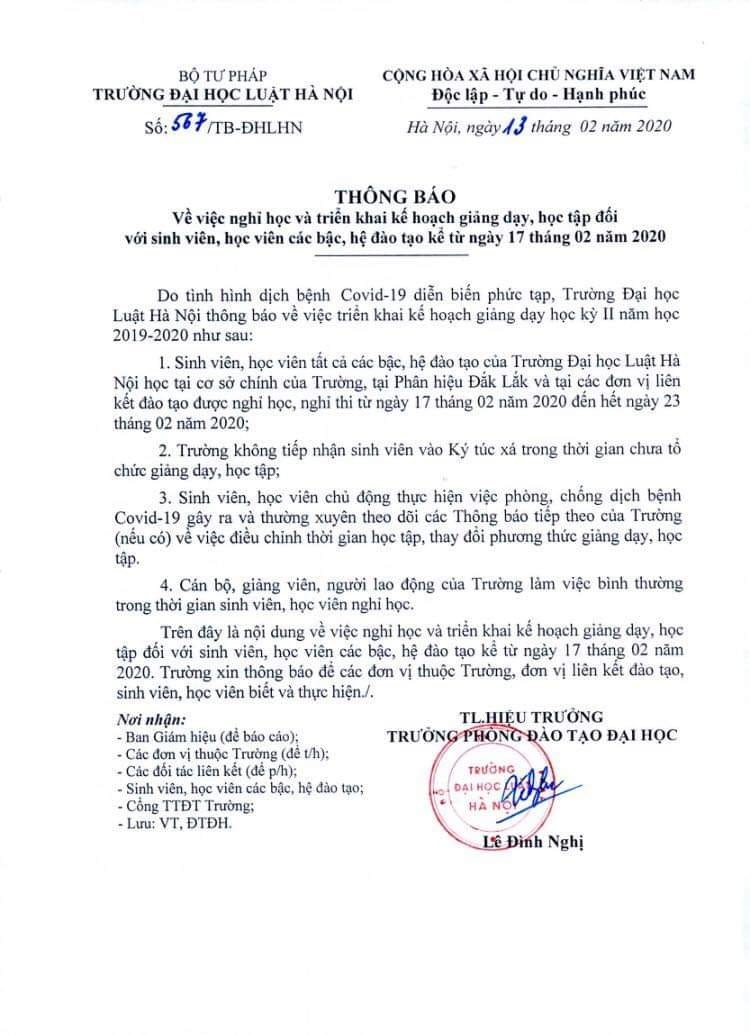 Theo thông báo mới của Trường Đại học Luật Hà Nội, lịch thi môn tin học học kỳ I năm học 2019-2020 có sự điều chỉnh, sinh viên khóa 44 chú ý thường xuyên theo dõi lịch và thông báo tiếp theo của nhà Trường.